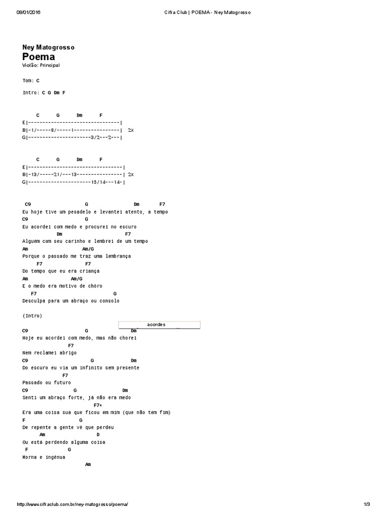 Conta a lenda que ele compôs poema quando tinha 17 anos e a entregou como um presente para a avó materna, por quem era apaixonado. Aprenda a tocar as músicas 'são francisco', 'poema', 'calúnias(telma eu não sou gay)', 'rosa de hiroshima', 'balada do louco' e todas as outras músicas no pega cifras. .o medo era desculpa para um abraço, um consolo. Print this page or download a pdf chord sheet print. Today (wednesday, 18/11), at 19 pm, ney matogrosso will talk to journalist denise marinho on instagram instagram.com/denise_marinho _. Seja o primeiro de seus amigos a curtir isso. Aprenda a tocar a cifra de poema (ney matogrosso) no cifra club. 4 minexibição em 27 jun 2008. Ney de souza pereira (bela vista, 1º de agosto de 1941), mais conhecido como ney matogrosso, é um cantor, diretor, iluminador e ator brasileiro. Eu hoje tive um pesadelo e levantei atento, a tempo eu acordei com medo e procurei no escuro alguém com seu carinho e lembrei de um tempo porque o passado me traz uma lembrança do tempo que eu era criança e o medo era motivo de choro desculpa pra um abraço. Eu hoje tive um pesadelo e levantei atento, a tempo eu acordei com medo e procurei no escuro alguém com seu carinho e lembrei de um tempo porque o passado me traz uma lembrança do tempo que eu era criança e o medo era motivo de choro desculpa pra um abraço ou. Eu hoje tive um pesadelo e levantei atento, a tempo / eu acordei com me. Cifra e música de poema (cifrada) de ney matogrosso.